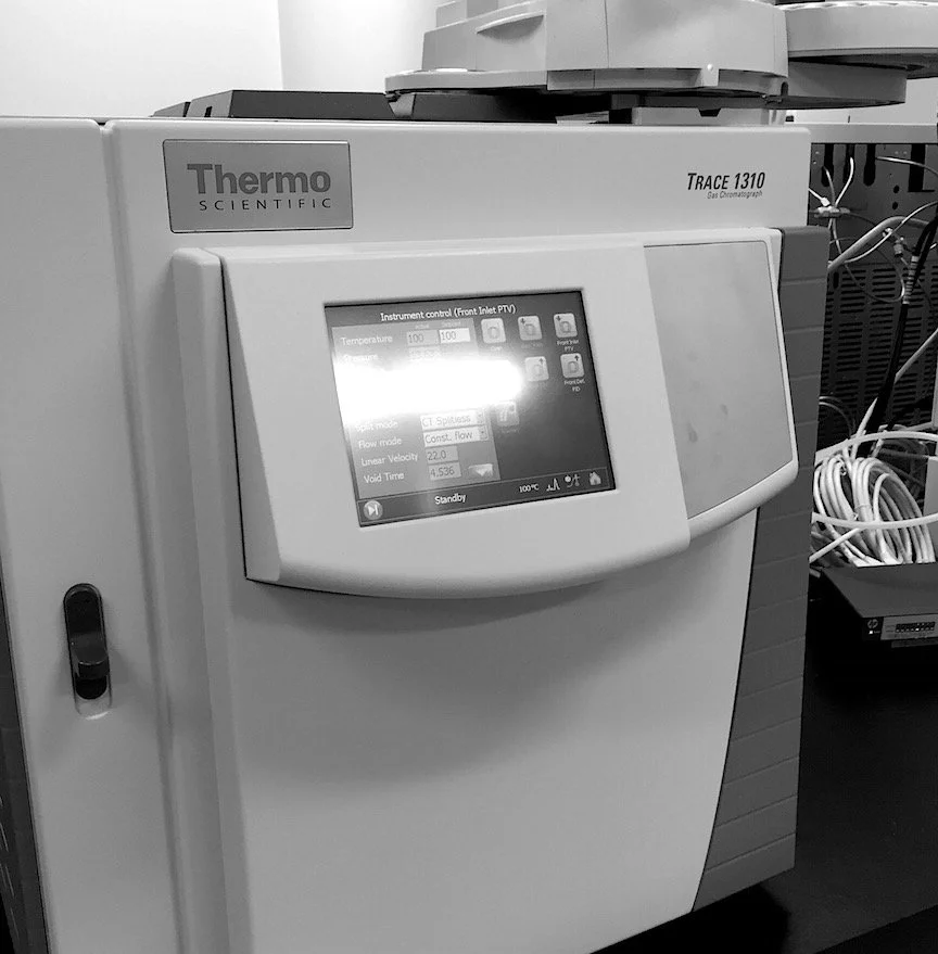 A Thermo Scientific Trace 1310 GC with a flame ionization detector. A workhorse of the lab, we use this for compound screening and quantification.