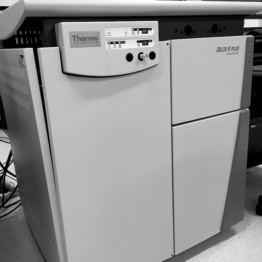 A Thermo Scientific Delta V Plus stable isotope mass spectrometer with a Conflo IV, Trace 1310 GC, and GC Isolink II. Measures stable carbon and hydrogen isotopes of organic compounds.